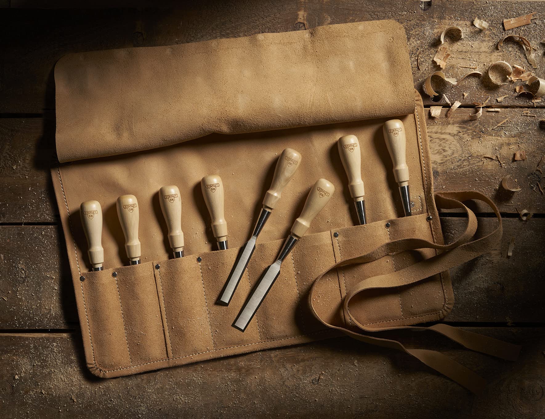 Set of eight chisels, individually boxed, supplied in a suede tool roll.
